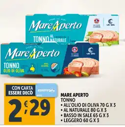 | MARE APERTO tonno all'olio di oliva g 60 x 6 | Deco Supermercati | €3,99 | 18 agosto 2023 | 29 agosto 2023 | |||