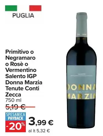 Primitivo o Negramaro o Rosè o Vermentino Salento IGP Donna Marzia Tenute Conti Zecca ora in promozione da Carrefour ✅ Offerta valida dal 27-12 al 6-01.