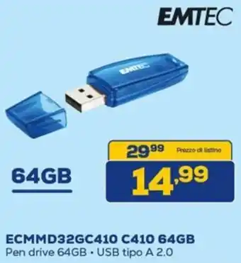 EMTEC ECMMD32GC410 C410 64GB ora in promozione da Euronics ✅ Offerta valida dal 19-02 al 4-03.