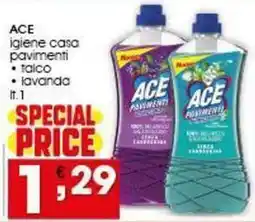 | ACE igiene casa pavimenti, talco, lavanda 1 lt | Iper Pellicano | €1,29 | 11 febbraio 2026 | 18 febbraio 2026 | |||