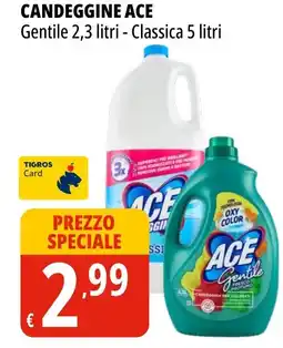 | Candeggina gentile ACE 2.3 L | Tigros | €3,89 | €2,99 | €0,90 Sconto | 10 marzo 2026 | 23 marzo 2026 | |