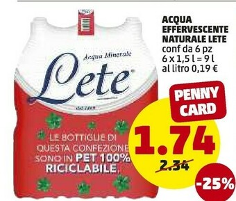 | ACQUA EFFERVESCENTE NATURALE LETE conf. da 6 pz - 6x1,5 l | PENNY | €2,64 | €1,98 | €0,66 Sconto | 21 marzo 2024 | 01 aprile 2024 | |