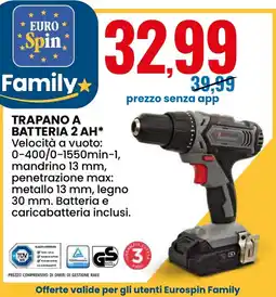 Eurospin Trapano a batteria 2 AH offertaTrapano a batteria 2 AHEurospin€39,99€32,99€7,00 Sconto15 gennaio 202625 gennaio 2026