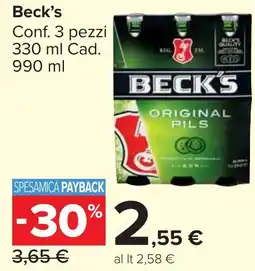 | 2 | Beck's 990 ml | Carrefour Market | €3,64 | €2,55 | -30% | 05 maggio 2026 | 18 maggio 2026 | Guarda l'offerta | |
