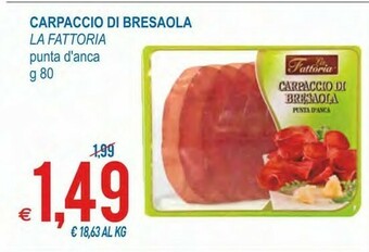 | La Fattoria Carpaccio Di Bresaola Punta D'Anca | MD Discount | €1,99 | €1,49 | €0,50 Sconto | 11 giugno 2021 | 20 giugno 2021 | |