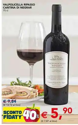 | 1 | Valpolicella ripasso cantina di negrar 75 cl | Esselunga | €9,84 | €5,90 | €3,94 Sconto | 08 aprile 2026 | 22 aprile 2026 | Guarda l'offerta | |