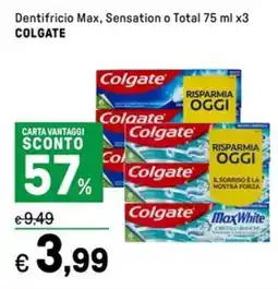 | Colgate Dentifricio Max o Sensation 75 ml x3 | Iper La Grande | €5,99 | €2,99 | €3,00 Sconto | 08 agosto 2022 | 21 agosto 2022 | |