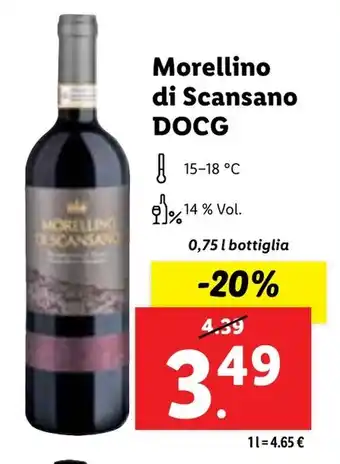 | Morellino di Scansano DOCG 0,75 l bottiglia | Lidl | €4,39 | €3,49 | €0,90 Sconto | 25 settembre 2023 | 01 ottobre 2023 | |