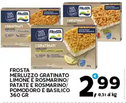 | Frosta merluzzo gratinato limone e rosmarino/ patate e rosmarino/ pomodoro e basilico 360 g | Extra Supermercati | €2,99 | 29 aprile 2026 | 11 maggio 2026 | |||