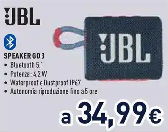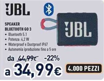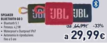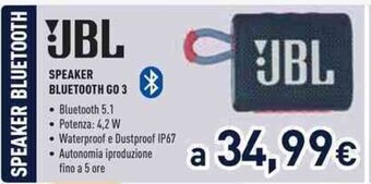 ![]() | JBL SPEAKER BLUETOOTH GO 3 | Unieuro | €44,99 | €34,99 | €10,00 Sconto | 23 giugno 2023 | 02 luglio 2023 |