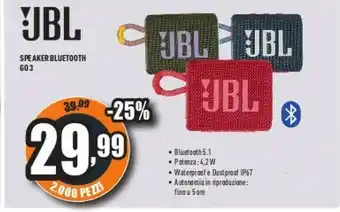 ![]() | JBL SPEAKER BLUETOOTH GO 3 | Unieuro | €34,99 | 17 agosto 2023 | 24 agosto 2023 | ||