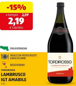 | 2 | Tordirosso lambrusco IGT amabile 1,5 l | ALDI | €2,59 | €2,19 | -15% | 12 gennaio 2026 | 18 gennaio 2026 | Guarda l'offerta | |