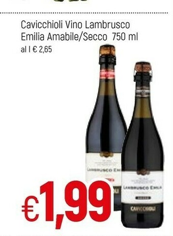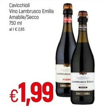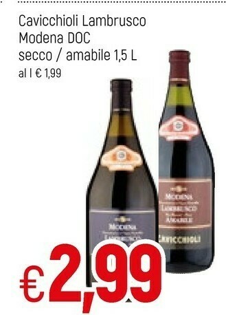 ![]() | Cavicchioli Lambrusco Emilia Secco 750 G(ml) | Famila | €1,99 | 05 agosto 2021 | 18 agosto 2021 | ||
