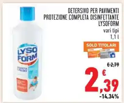 | Detergente pavimenti disinfetta e pulisce LYSOFORM 1,1 lt | Iperal | €2,59 | €1,99 | €0,60 Sconto | 25 marzo 2026 | 07 aprile 2026 | |
