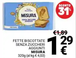 | Fette biscottate senza zuccheri aggiunti MISURA 320 g | Supermercati Gulliver | €1,89 | €1,29 | €0,60 Sconto | 24 febbraio 2026 | 05 marzo 2026 | |