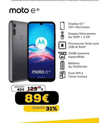 | Moto e6i 15,5 cm (6.1") 4g micro-usb 2 gb 32 gb 3000 mah grigio | Euronics | €89,00 | 31% | 28 ottobre 2021 | 10 novembre 2021 | ||