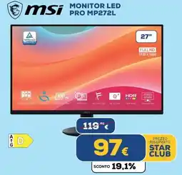 | msi MONITOR LED PRO MP272L | Euronics | €119,99 | €97,00 | €22,99 Sconto | 20 febbraio 2026 | 04 marzo 2026 | |