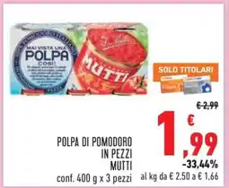 | Polpa di pomodoro MUTTI | Conad | €1,97 | €0,99 | €0,98 Sconto | 04 settembre 2024 | 17 settembre 2024 | |