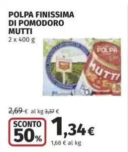 | POLPA DI POMODORO FINISSIMA MUTTI 2 x 400 g | Coop | €2,65 | €1,59 | €1,06 Sconto | 18 gennaio 2024 | 31 gennaio 2024 | |