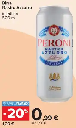 | 1 | Birra Nastro Azzurro 500 ml | Carrefour | €1,24 | €0,99 | -20% | 05 maggio 2026 | 18 maggio 2026 | Guarda l'offerta | |