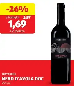 | 2 | Costadune nero d'avola DOC 750 ml | ALDI | €2,29 | €1,69 | -26% | 02 marzo 2026 | 08 marzo 2026 | Guarda l'offerta | |