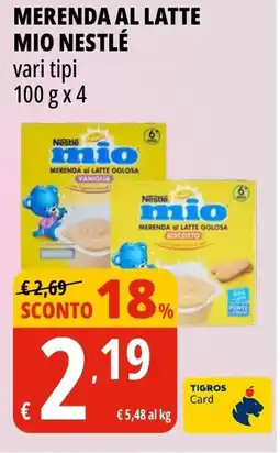 | Nestlé Mio Mini Merenda 60g x 6 | Tigros | €2,29 | €1,79 | €0,50 Sconto | 08 ottobre 2021 | 07 novembre 2021 | |
