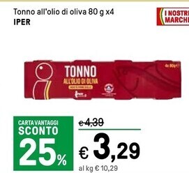 | Tonno all'olio di oliva IPER 4 x 70 g | Iper La Grande | €4,39 | €3,49 | -20% | 03 novembre 2025 | 16 novembre 2025 | |