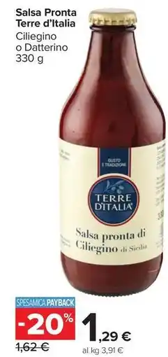| Salsa Pronta Terre d'Italia Ciliegino o Datterino 330 g | Carrefour Market | €1,62 | €1,29 | -20% | 27 gennaio 2026 | 05 febbraio 2026 | |