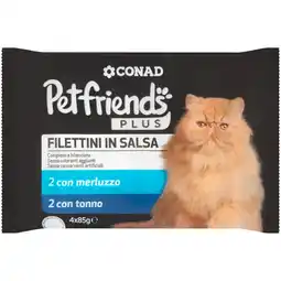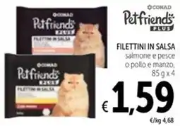 | Filettini in salsa Pet friends 85 g x 4 | Spazio Conad | €1,59 | 01 aprile 2025 | 09 aprile 2025 | |||
