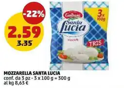 | MOZZARELLA SANTA LUCIA conf. da 3 pz - 3 x 100 g = 300 g | PENNY | €3,29 | €2,89 | €0,40 Sconto | 12 ottobre 2023 | 22 ottobre 2023 | |