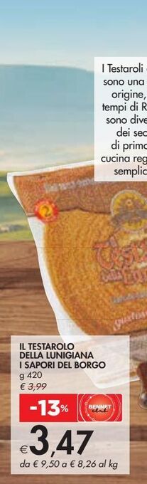 | Il testarolo della lunigiana i sapori del borgo g 420 | Bennet | €3,99 | €3,47 | €0,52 Sconto | 13 ottobre 2022 | 26 ottobre 2022 | |