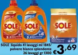 | SOLE liquido 41 lavaggi ml 1845/ polvere bianco splendente 1300 g | Eurospesa | €3,69 | 12 febbraio 2026 | 25 febbraio 2026 | |||