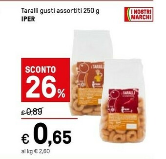| Consilia taralli pugliesi 250 g | Iper Triscount | €0,99 | 27 novembre 2025 | 05 dicembre 2025 | |||