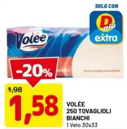 | VOLÉE 250 tovaglioli bianchi 1 velo 30 x 33 | DPiù | €1,98 | €1,58 | -20% | 07 luglio 2025 | 20 luglio 2025 | |