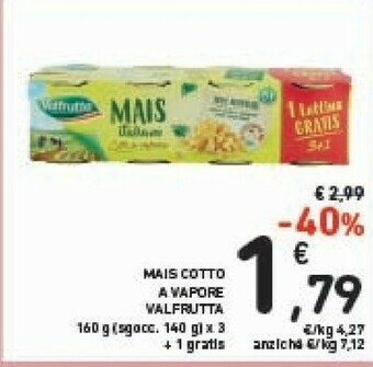 | Mais cotto a vapore VALFRUTTA 3 x 160 g | Conad | €3,19 | €1,89 | -40% | 12 agosto 2025 | 26 agosto 2025 | |