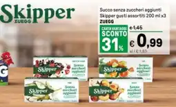 | 1 | Succo senza zuccheri aggiunti SkipperSenza zuccheri aggiunti ZUEGG | Iper La Grande | €1,45 | €0,99 | SCONTO 31% | 23 gennaio 2026 | 04 febbraio 2026 | Guarda l'offerta | |